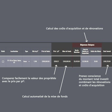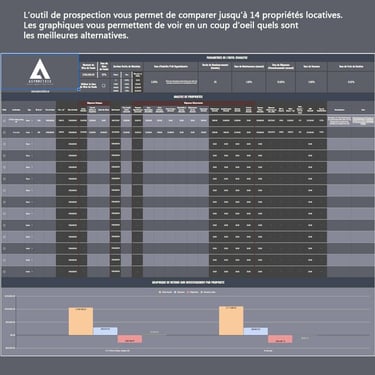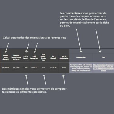 Notre Google Sheet d'Analyse Immo Locatif te permet de comparer jusqu'à 14 propriétés sur plus de 12 métriques comme le Cap Rate, le Cash Flow, le Rendement Total et bien d'autres.